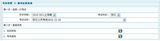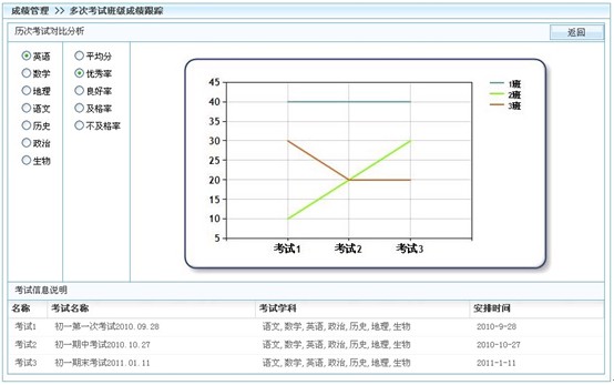 12.成绩管理本模块针对学生成绩管理工作的需要,提供了成绩管理统计与分析功能,通过设置考试信息,把考试成绩录入或者导入系统,教师可以针对学生、班级的单次或多次考试进行横纵向、多维度的查询分析,分析指标全面、详尽,附带柱状图、靶状图、曲线等图形分析,形象直观反映教学成果;批卷结束后可快速召开教学质量分析会;减轻教务处、班主任和任课教师的成绩统计分析负担,为校长在考试结束的第一时间提供科学、全面、准确的分析结果,使之对下一步教学工作进行科学调控。