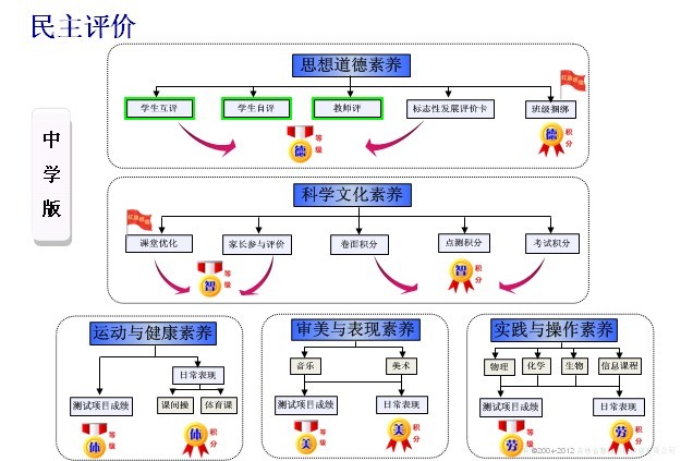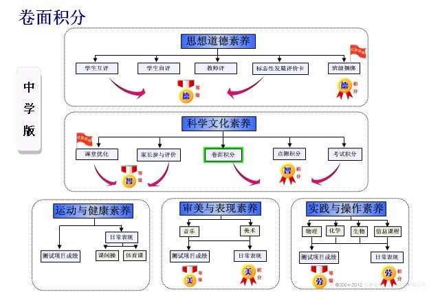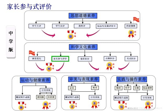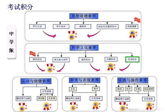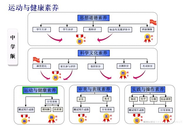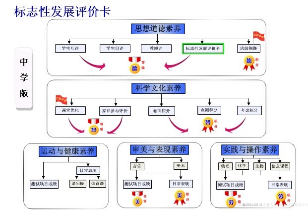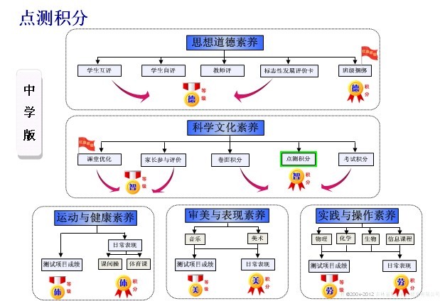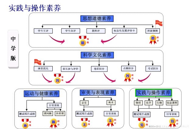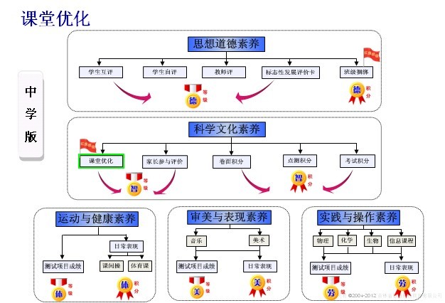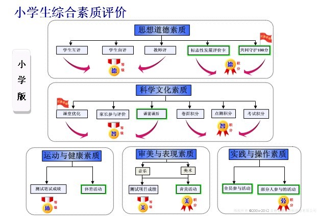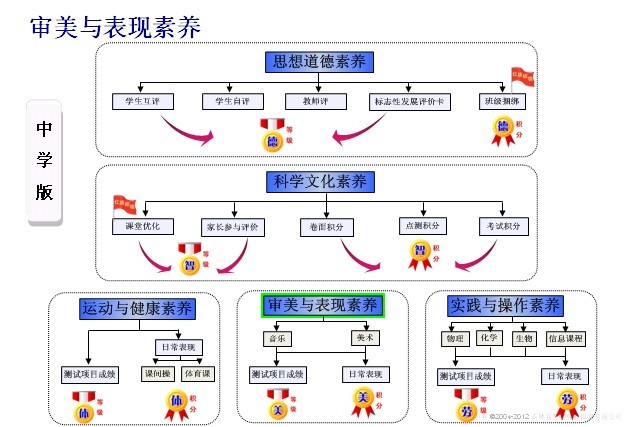 14.学生综合素质评价为了实现对学生进行全面、客观、科学的评价,系统从思想道德、科学文化、运动与健康、审美与表现、实践与操作五个维度对学生进行全方位的评价,实时贯穿学生在校学习全过程,通过多维度的评价方式不断激发学生的内在成长动力,使学生各方面能力都得到不断的提高,到学生毕业时,系统能自动形成贯穿学生成长过程的一个全面、科学、公正的终结性评价结果,作为学生升学的重要依据。