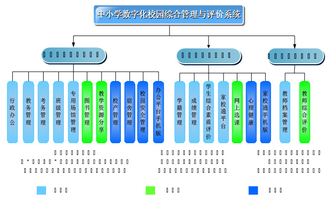 “中小学数字化校园综合管理与评价系统”包括行政办公、教务管理、考务管理、班级管理、教学资源管理、图书管理、专用场馆管理、校产管理、宿舍管理、校园安全管理、学籍管理、成绩管理、网上选课、学生综合素质评价、心理健康、家校通、教师档案管理、教师综合评价等模块,能有效实现中小学校的标准化、规范化、精细化、科学化、智能化管理。