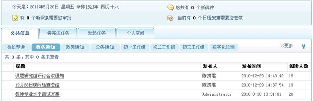 本模块针对校园行政办公的基础业务需要,设置了信息发布、日程管理、留言管理、请假管理等功能,是具有校园特色的自动化办公平台,能使学校实现无纸化、零电话的现代化办公模式,实现新闻、信息、通知、资源的及时传达和共享,实现校园管理精细化、规范化、智能化。