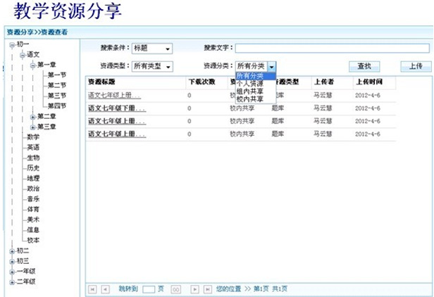 5.教学资源管理为了实现资源共享,本系统提供了教学资源管理平台,实现了教学资源多维度自定义分类、轻松快捷检索;教学设计、教学案、课件、作业、素材、视频课例、教学案例/反思、学案等的建立、更新;系统提供教师上传和下载资源的积分体制,促进资源库的更新、完备。