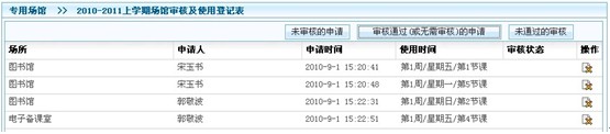 7.专用场馆管理本模块针对专用场馆使用和管理的需要,设置了体育场馆、实验室、音乐教室、机房、多媒体教室、电子备课室等专用场馆使用的申请、审批、统计功能,能有效解决场馆的使用冲突,便于协调安排各场馆的使用,统计场馆使用率等。