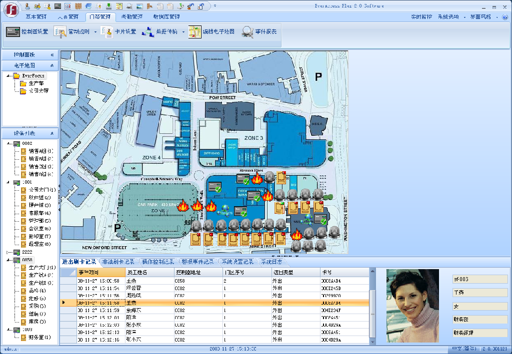 5)实时监控:对整个系统的软硬件和人员进出情况和系统等进行监管。包括:日期、时间、持卡者、控制器、门区和进出状况(进入或外出)、卡号等。持卡者资料将显示当前记录持卡者的详细个人资料,非法刷卡记录将记录所有非法刷卡事件,包括无效时区、无效门区、无效卡片、试图潜入,记录内容包括日期、时间、持卡者、控制器、门区、事件和类型、卡号等。