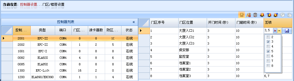 注意:这里互锁的门仅限于同一个控制器管理的门进行互锁,同一控制器可以设置多门(门数≤8)互锁。以EFC-08-2A八门控制器为例(如图 5‑9),如1号门区的互锁功能下显示“2,3,5”,表示当2,3,5号门区中的任意一个门区打开时,1号门不能被打开。