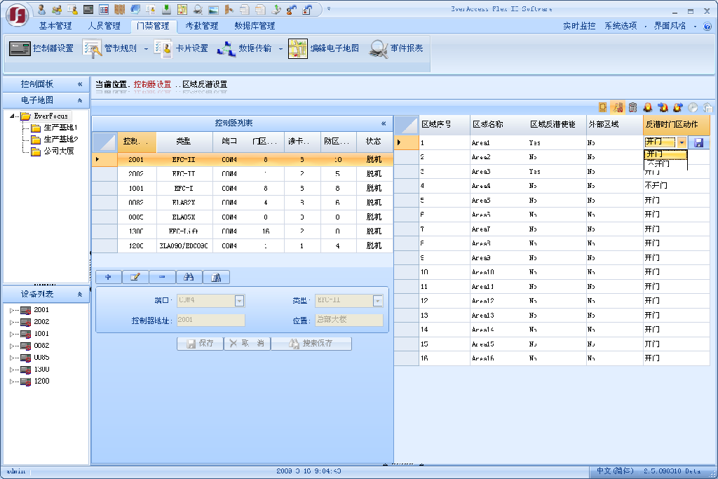 主要是针对控制器(门禁控制器和电梯控制器)的各项参数进行设置。包括添加/删除控制器、控制器属性设置、读卡器设置、报警设置和其他设置等等。可以根据需要根据控制器安装的位置命名控制器,包括:门区位置、读卡器设置、报警设置、区域反潜设置和其他设置等。