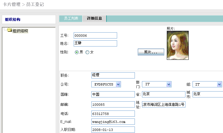 4)卡片管理:主要进行卡片的发放和使用期限的限定和设置。包括照片、姓名、性别、年龄、部门和职务等。