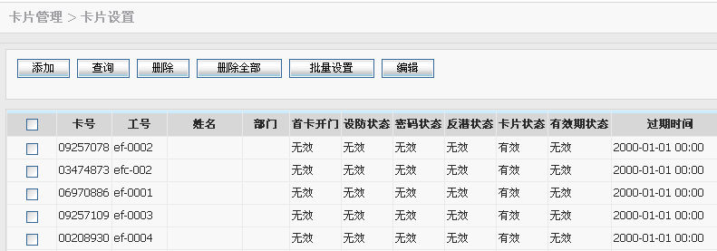 包括添加、查询、删除、设置、编辑卡片等内容。其中重点是设置下面几项内容:首卡开门(也叫首次进入自动开启)、设防、密码、反潜、卡片有/无效和有效期状态等。