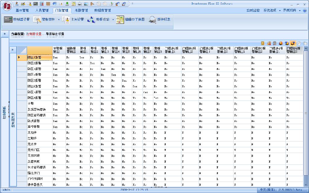 FLEX控制器会记录所有发生的事件,包括合法和非法的,正常和不正常的,比如允许进入和禁止进入等等。有些事件是很危险的,就要触发警报输出,比如火警输入,防区警报输入等等。此软件集合了所有可能触发警报输出的事件记录并对这些事件提供了警报有效或无效的选择。
